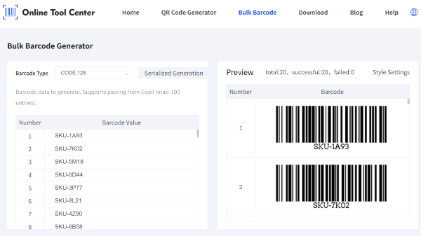 Số lượng lớn tạo mã vạch trực tuyến miễn phí. Tạo mã 128, UPC, EAN, mã 39 và mã QR trong vài giây. Hoàn hảo cho các nhóm bán lẻ, kho và thương mại điện tử.