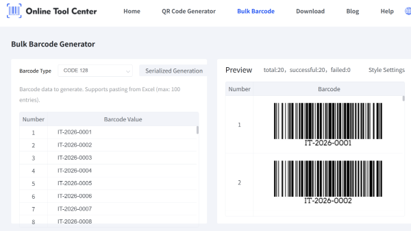 Tạo nhiều mã vạch số lượng lớn từ Excel hoặc CSV. Máy tạo mã vạch trực tuyến miễn phí hỗ trợ Mã 128, EAN-13, UPC-A và định dạng xuất khẩu sẵn sàng in.